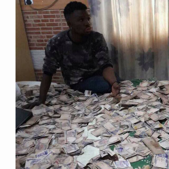 A Nigerian Big Boy who calls himself Owoboy has showed off pictures of himself sleeping in bundles of Naira notes on his Social Media, and has said he’s in search of a lady who’d be his baby mama.