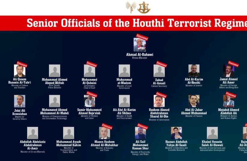 According to Israeli security sources cited by Army Radio, at least eight additional senior Houthi officials were also killed. In total, the list of casualties includes 11 ministers: Culture and Tourism Minister Ali Qasem Hussein al-Yafe’i, Foreign Minister Jamal Ahmed Ali Amer, Information Minister Hashem Ahmed Abdulrahman Sharaf al-Din, Justice Minister Mujahid Ahmed Abdullah Ali, Welfare and Labor Minister Samir Mohammed Ahmed Baja’alah, Youth and Sports Minister Mohammed Ahmed Ali al-Muwallad, Electricity and Energy Minister Ali Saif Mohammed Hassan Shar, Industry and Trade Minister Maeen Hashem Ahmed al-Mahakhar, Agriculture and Fisheries Minister Rajwan Ali Ali al-Rubaie, as well as government chief of staff Mohammed al-Qubaisi and cabinet secretary Zahad al-Amadi.