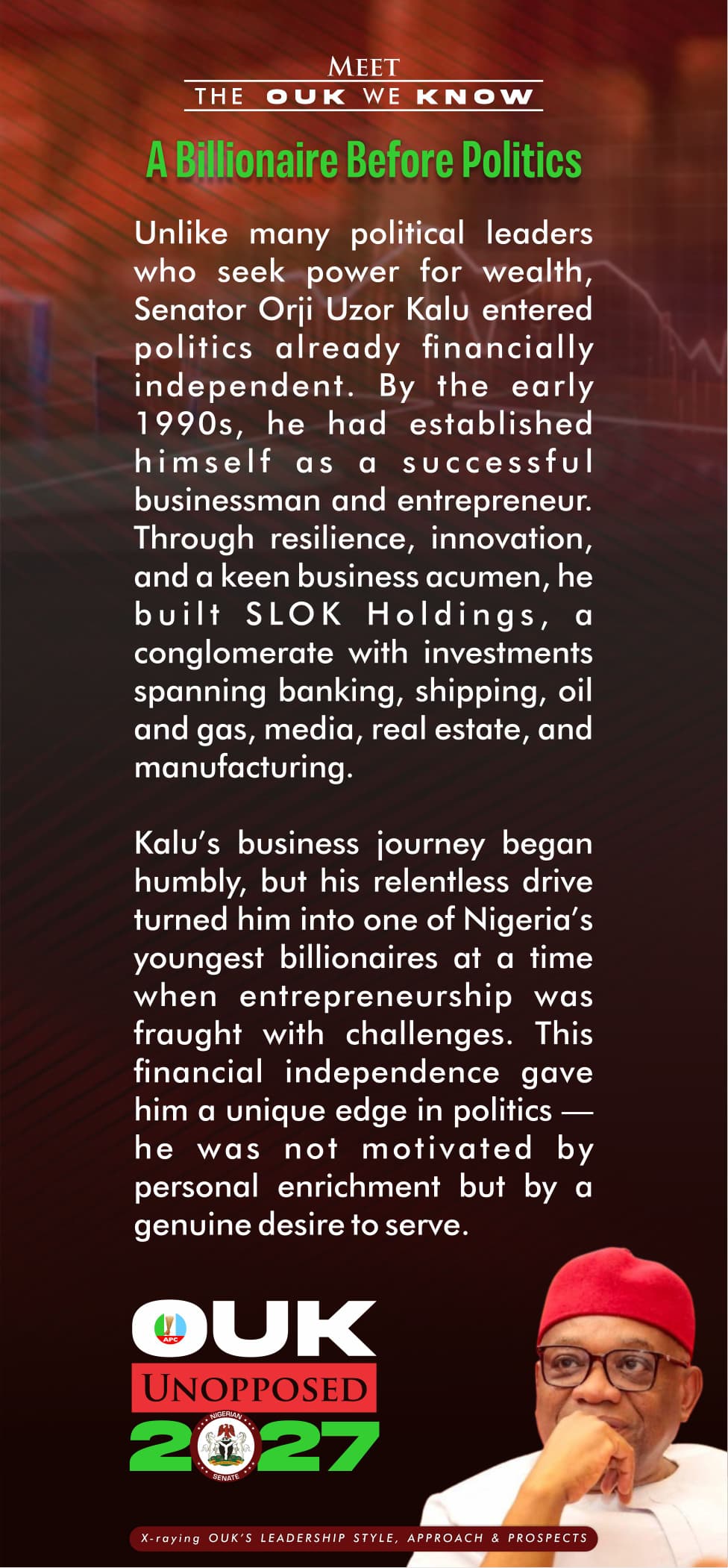 Unlike many political leaders who seek power for wealth, Senator Orji Uzor Kalu entered politics already financially independent. By the early 1990s, he had established himself as a successful businessman and entrepreneur. Through resilience, innovation, and a keen business acumen, he built SLOK Holdings, a conglomerate with investments spanning banking, shipping, oil and gas, media, real estate, and manufacturing.