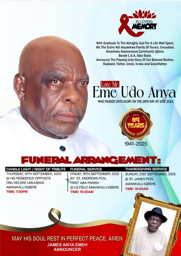 The community of Igbere in Bende Local Government Area prepares to gather *today*, Friday, September 19, 2025, for the final burial rites of Chief Eme Udo Anya, the beloved father of prominent media entrepreneur and CEO of IgbereTV, Mr. James Emeh.