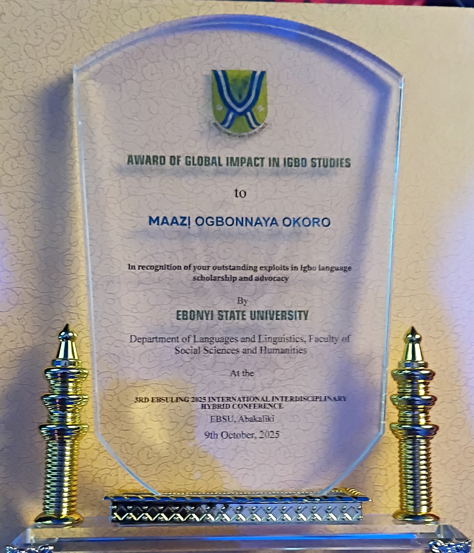 Acknowledging the award in a post on his social media page, he wrote; “I have received an “Award of Global Impact in Igbo Studies” from the Department of Languages and Linguistics, Ebonyi State University.