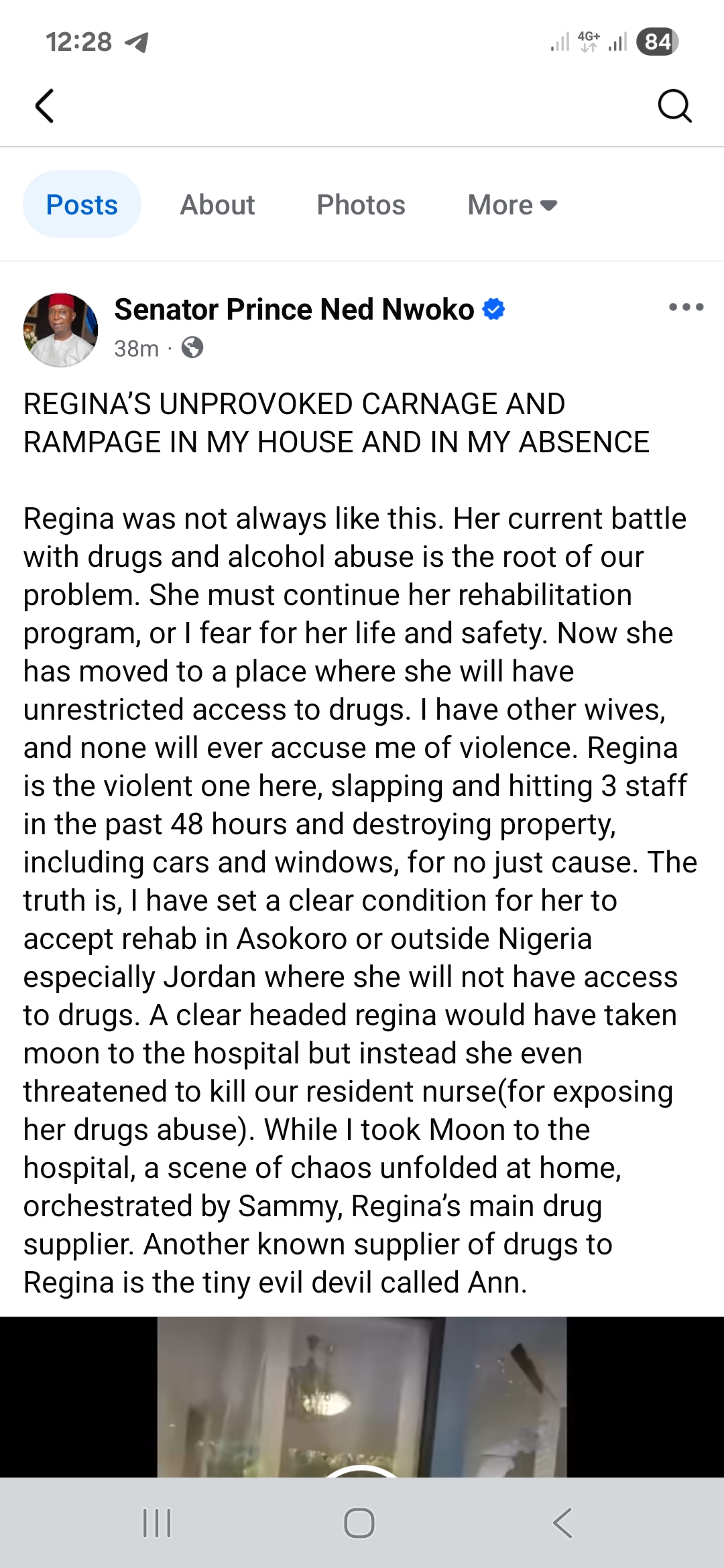 ” Regina was not always like this. Her current battle with drugs and alcohol abuse is the root of our problem. She must continue her rehabilitation program, or I fear for her life and safety. Now she has moved to a place where she will have unrestricted access to drugs. I have other wives, and none will ever accuse me of violence. Regina is the violent one here, slapping and hitting 3 staff in the past 48 hours and destroying property, including cars and windows, for no just cause. The truth is, I have set a clear condition for her to accept rehab in Asokoro or outside Nigeria especially Jordan where she will not have access to drugs. A clear headed regina would have taken moon to the hospital but instead she even threatened to kill our resident nurse(for exposing her drugs abuse). While I took Moon to the hospital, a scene of chaos unfolded at home, orchestrated by Sammy, Regina’s main drug supplier. Another known supplier of drugs to Regina is the tiny evil devil called Ann.”.
