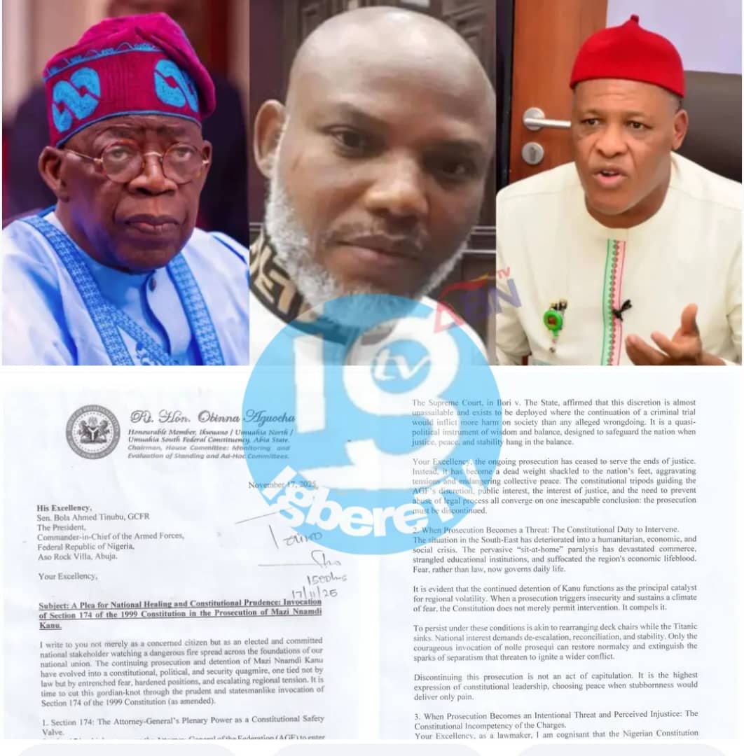 A federal lawmaker, Hon. Obinna Aguocha, has written to President Bola Ahmed Tinubu, urging him to invoke Section 174 of the 1999 Constitution to discontinue the prosecution of the detained leader of the Indigenous People of Biafra (IPOB), Mazi Nnamdi Kanu.
