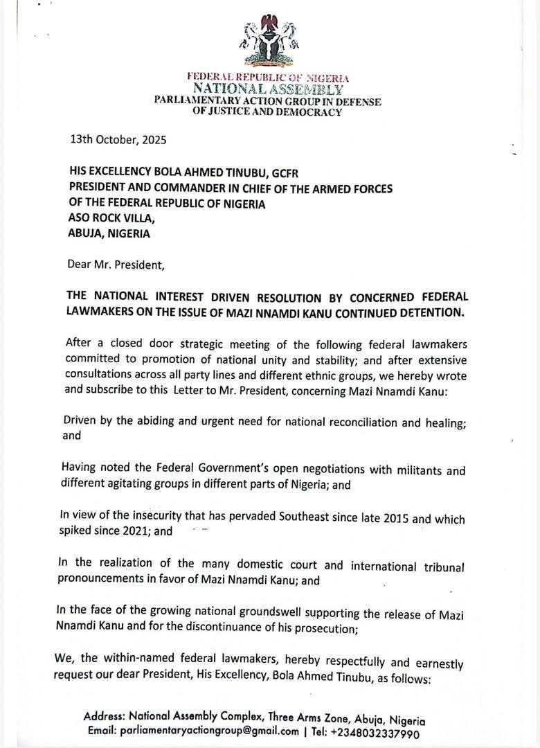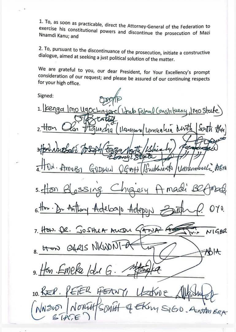 The letter read in part, “Dear Mr. President, THE NATIONAL INTEREST DRIVEN RESOLUTION BY CONCERNED FEDERAL LAWMAKERS ON THE ISSUE OF MAZI NNAMDI KANU CONTINUED DETENTION, after a closed door strategic meeting of the following federal lawmakers committed to promotion of national unity and stability; and after extensive consultations across all party lines and different ethnic groups, we hereby wrote and subscribe to this Letter to Mr. President, concerning Mazi Nnamdi Kanu: Driven by the abiding and urgent need for national reconciliation and healing; and Having noted the Federal Government’s open negotiations with militants and different agitating groups in different parts of Nigeria; and in view of the insecurity that has pervaded Southeast since late 2015 and which spiked since 2021; andIn the realization of the many domestic court and international tribunal pronouncements in favor of Mazi Nnamdi Kanu; and In the face of the growing national groundswell supporting the release of Mazi Nnamdi Kanu and for the discontinuance of his prosecution.