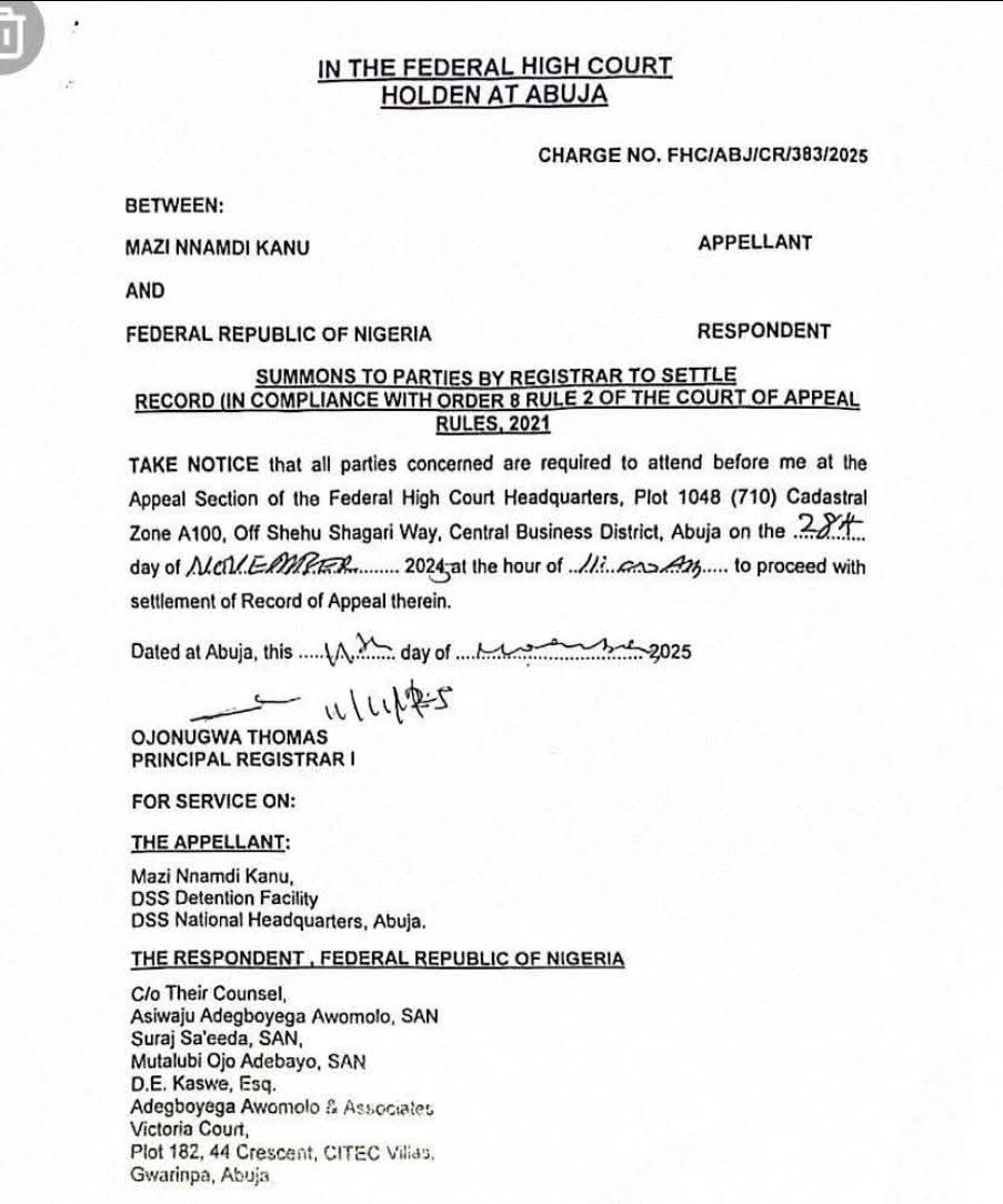 According to Kanu’s Brother, Prince Kanu, “This is a summons to Mazi Nnamdi Kanu to appear on November 28 at the Federal High Court in Abuja for the settlement of records regarding the appeal he filed prior to the November 20 judgment.”