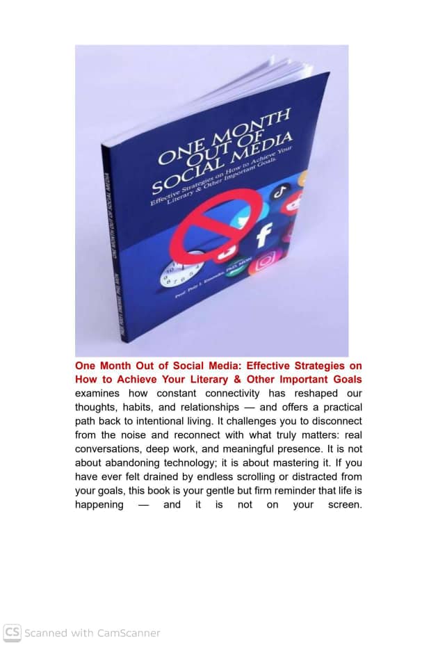 In “ONE MONTH OUT OF SOCIAL MEDIA: Effective Strategies on How to Achieve Your Literary & Other Important Goals”, Prof. Emenike confronts digital dependency and its effects on productivity and mental clarity. The book offers strategies for reclaiming focus and purpose in an age of distraction, urging readers to rethink their relationship with screens, reconnect with meaningful work, and rediscover the discipline required for literary and life goals.