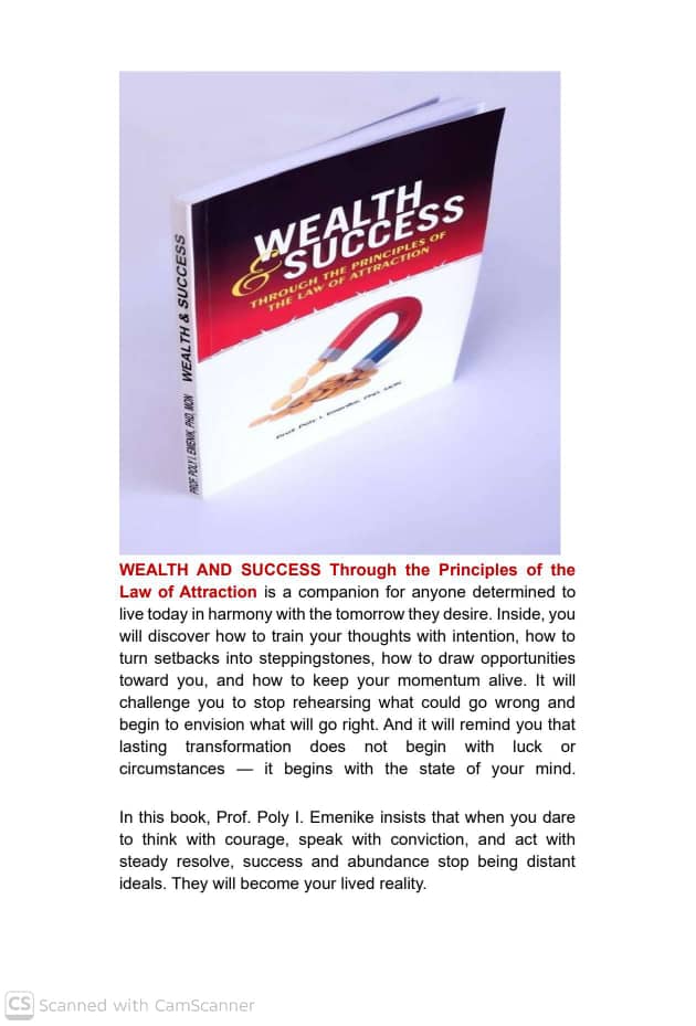 In “Wealth and Success Through the Principles of the Law of Attraction”, Prof. Emenike outlines psychological and practical steps for shaping personal outcomes through clarity of thought, mental discipline, and purposeful living. The work challenges readers to cultivate a mindset that attracts opportunities, builds resilience, and transforms setbacks into leverage.