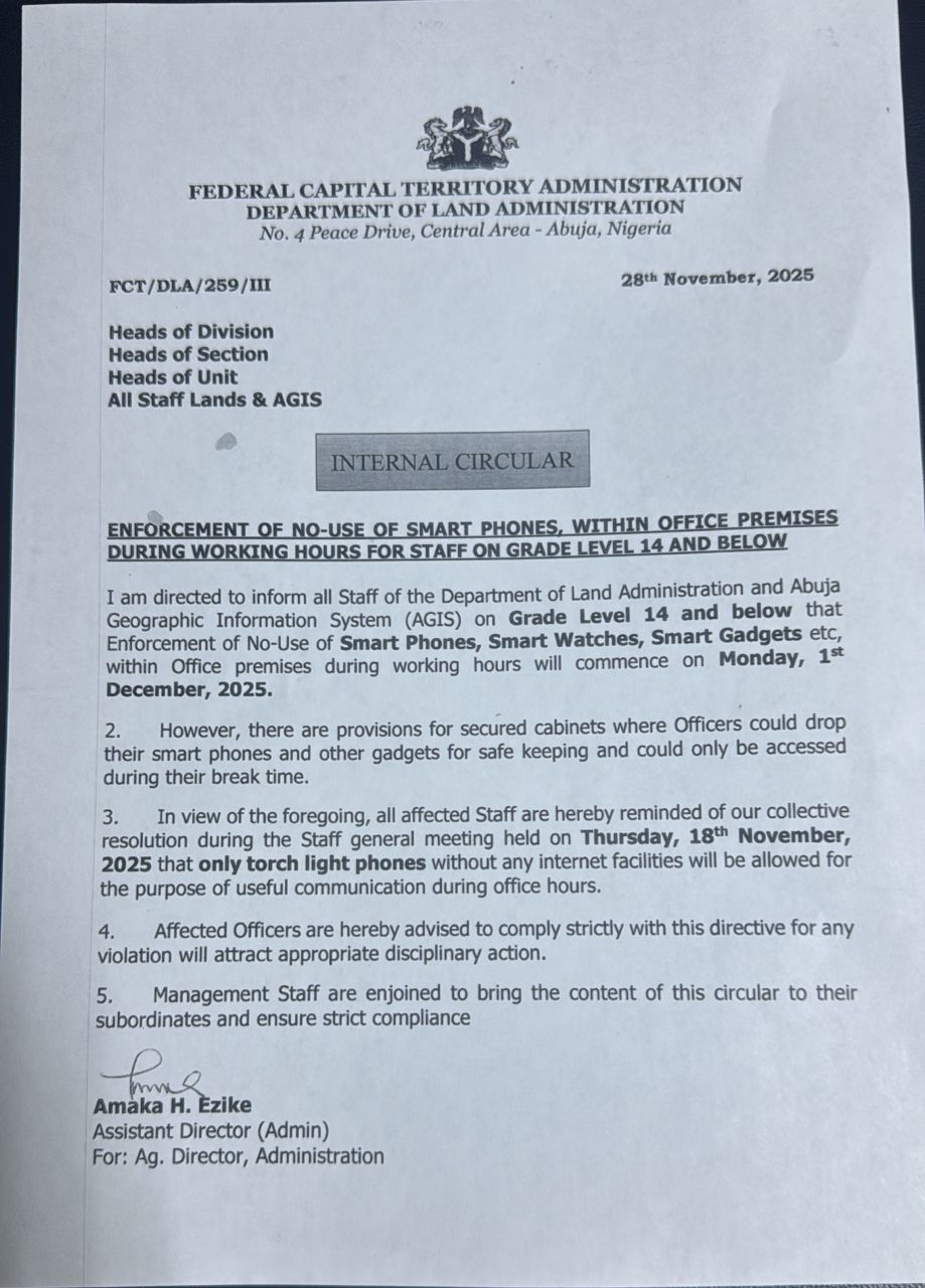 The statement read, “I am directed to inform all Staff of the Department of Land Administration and Abuja Geographic Information System (AGIS) on Grade Level 14 and below that Enforcement of No-Use of Smart Phones, Smart Watches, Smart Gadgets etc, within Office premises during working hours will commence on Monday, 1st December, 2025.