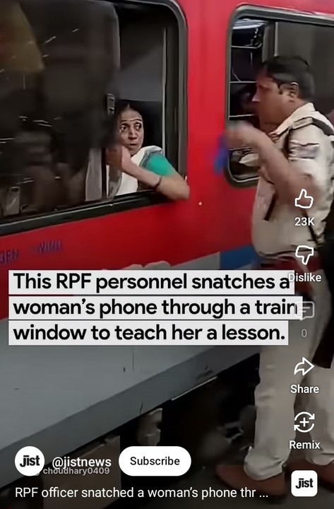 The RPF police officer snatched a woman’s phone through the window of a railway coach as she was caught off guards completely unaware of the lurking presence while engaging in a conversation with fellow passengers on board the train.