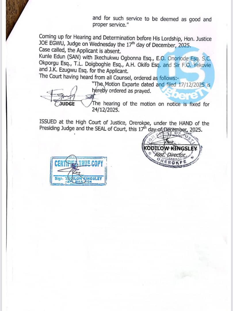 The order was issued on Wednesday, 17th December, 2025 by Hon. Justice Joe Egwu.