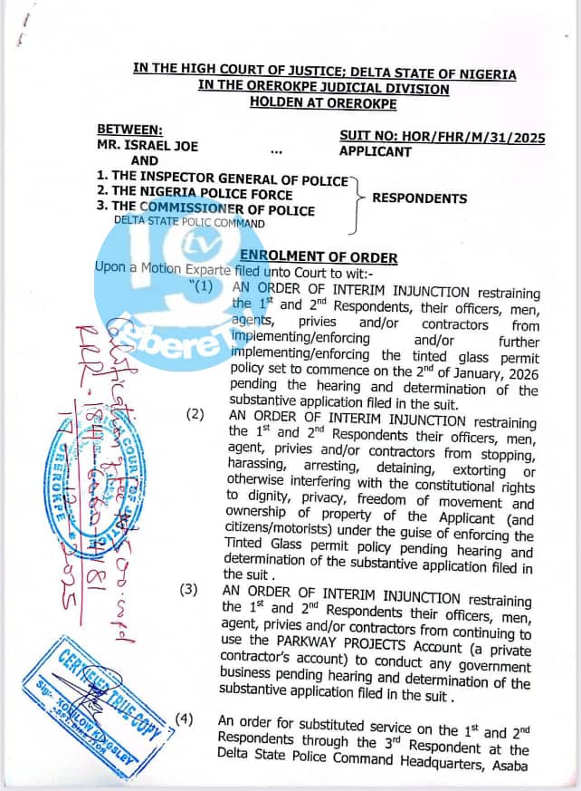 The High Court of Delta State has issued an ex-parte injunction stopping and barring the Inspector General of Police and the Nigeria Police Force from resuming the enforcement of the tinted glass permit policy nationwide.