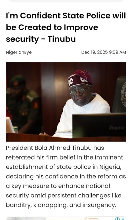 President Bola Ahmed Tinubu has reiterated his firm belief in the imminent establishment of state police in Nigeria, declaring his confidence in the reform as a key measure to enhance national security amid persistent challenges like banditry, kidnapping, and insurgency.