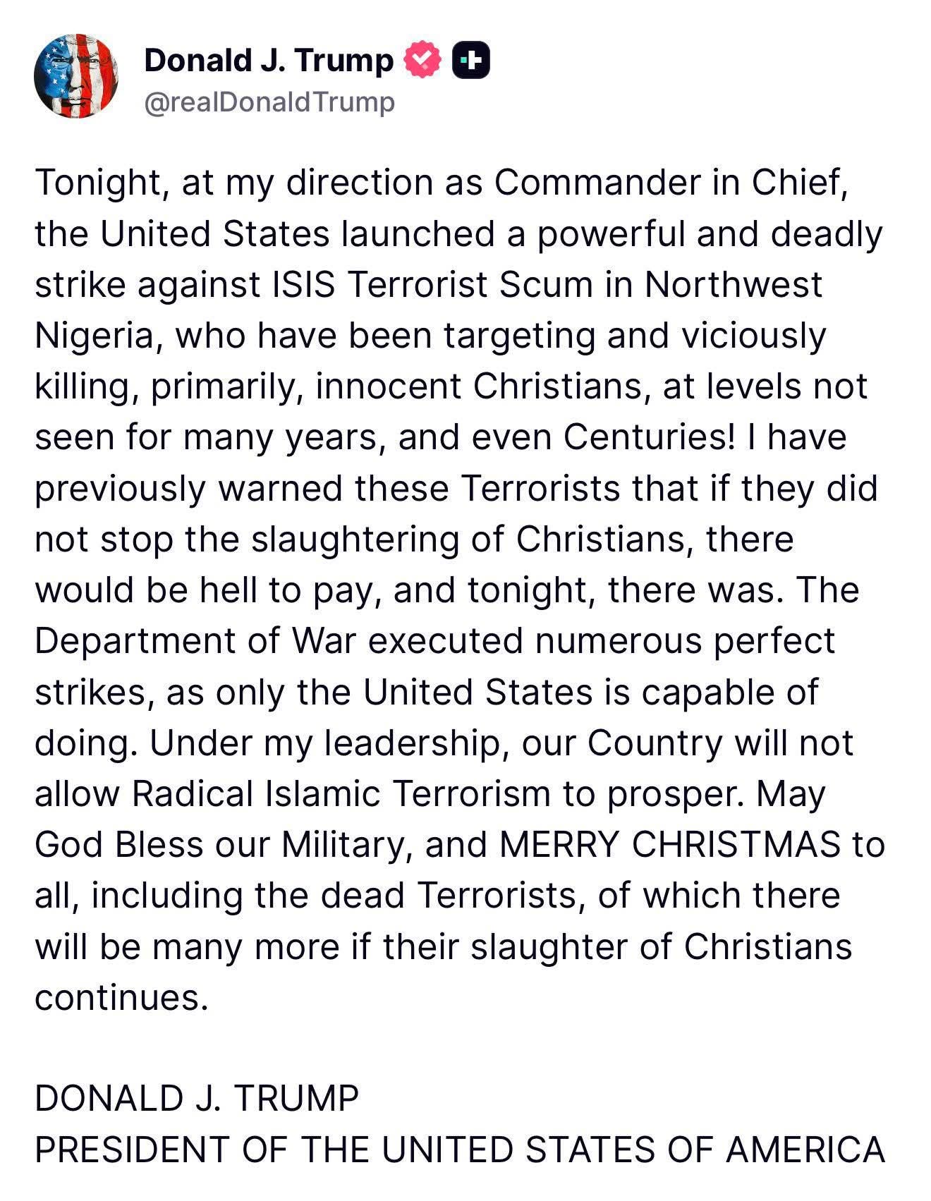 Tonight, at my direction as Commander in Chief, the United States launched a powerful and deadly strike against ISIS Terrorist Scum in Northwest Nigeria, who have been targeting and viciously killing, primarily, innocent Christians, at levels not seen for many years, and even Centuries!