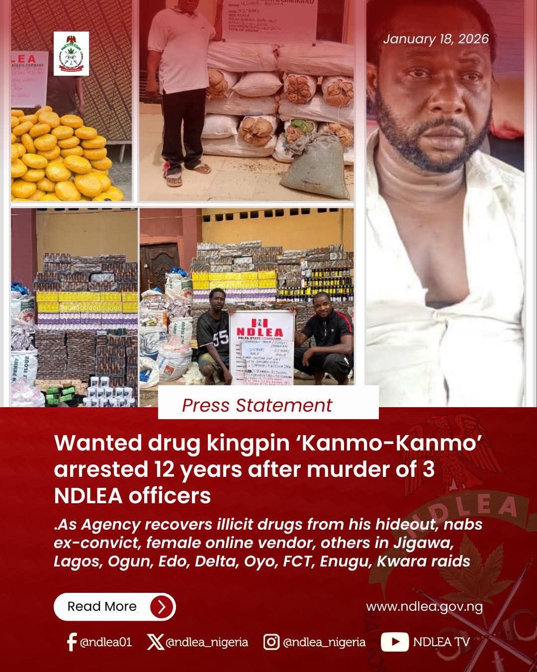 He described the arrest of Kanmo-kanmo as a triumph of justice and a testament to the Agency’s long memory, adding that the arrest sends a clear and unambiguous message to all drug barons and fugitives: “You may run, and you may hide for a season, but the long arm of the law will eventually find you.”