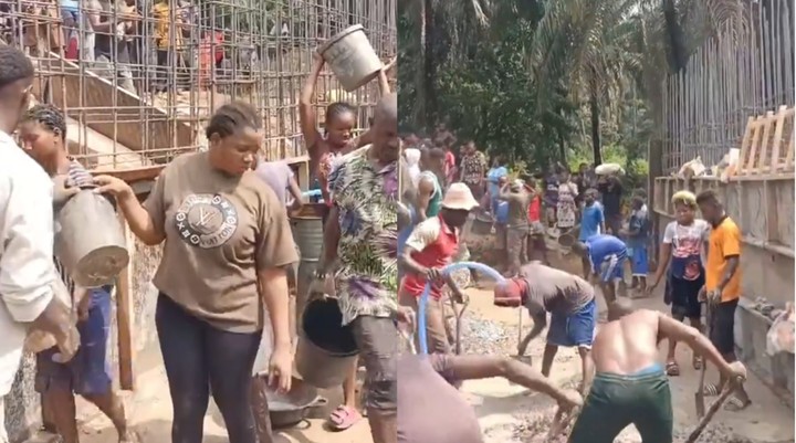 Footage of the community at work shows some individuals mixing cement, while others carry materials to pour for the bridgeβs foundation. The structure appears massive, highlighting the scale of the project and the determination of the people involved.