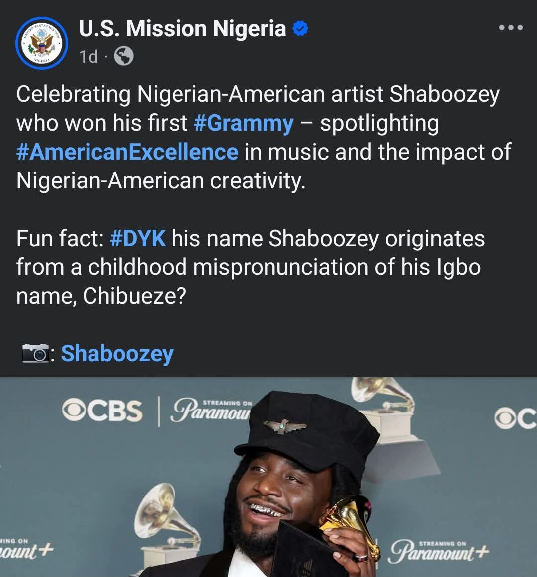 Los Angeles, Feb. 1, 2026 — Nigerian-American artist Shaboozey achieved a major milestone at the 68th Annual Grammy Awards, winning his first Grammy for Best Country Duo/Group Performance alongside Jelly Roll for their song “Amen.” The award was presented during the ceremony’s Premiere event in Los Angeles.