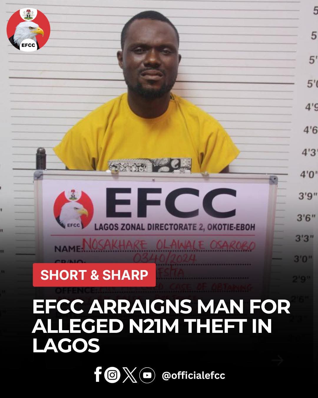 The Lagos Zonal Directorate 2 of the Economic and Financial Crimes Commission, EFCC, on Wednesday, February 18, 2026, arraigned one Nosakhare Osarobo Olawale for an alleged N21m theft before Justice O.A. OKunuga of the Lagos State High Court sitting in Ikeja, Lagos.