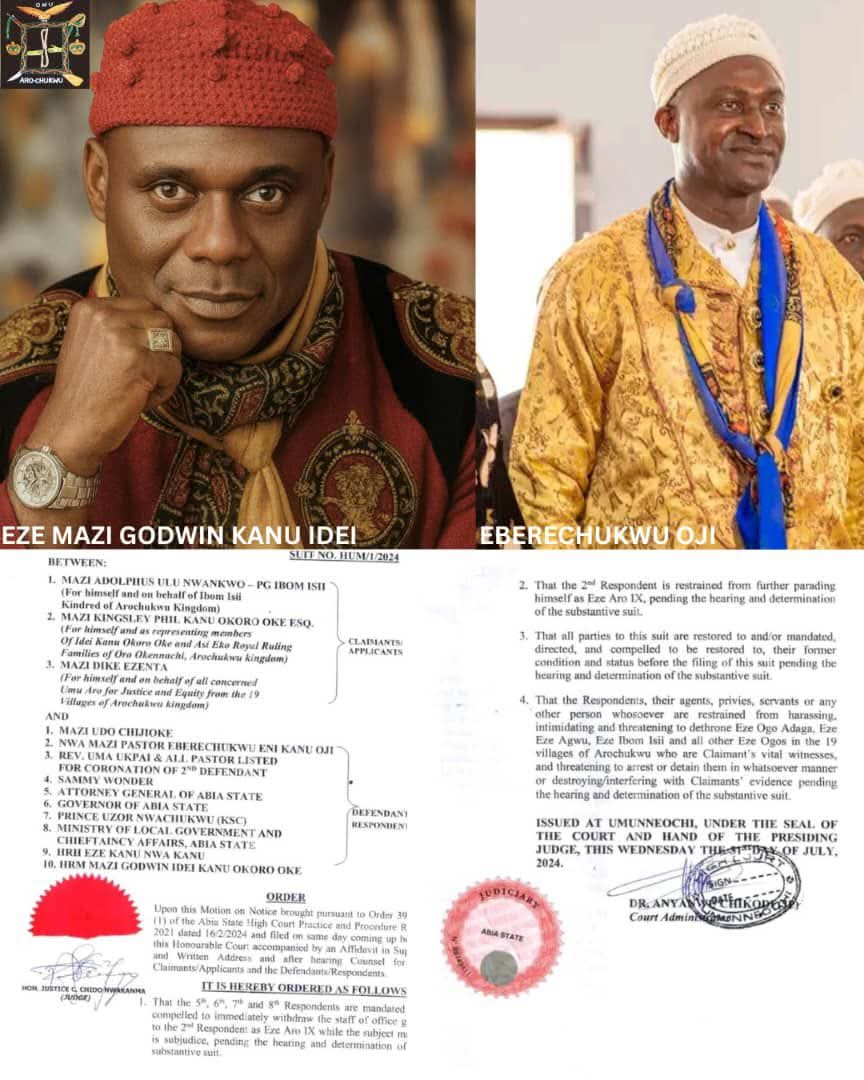 Furthermore, on 21st February 2024, the High Court of Abia State sitting at Umuuneochi Judicial Division, in Suit No. HUM/1/2024, issued an order restraining actions capable of interfering with or undermining the pending judicial process relating to the Arochukwu kingship dispute. This subsisting order remains binding and reinforces the obligation of all parties and stakeholders to conduct themselves lawfully and with restraint pending judicial finality.
