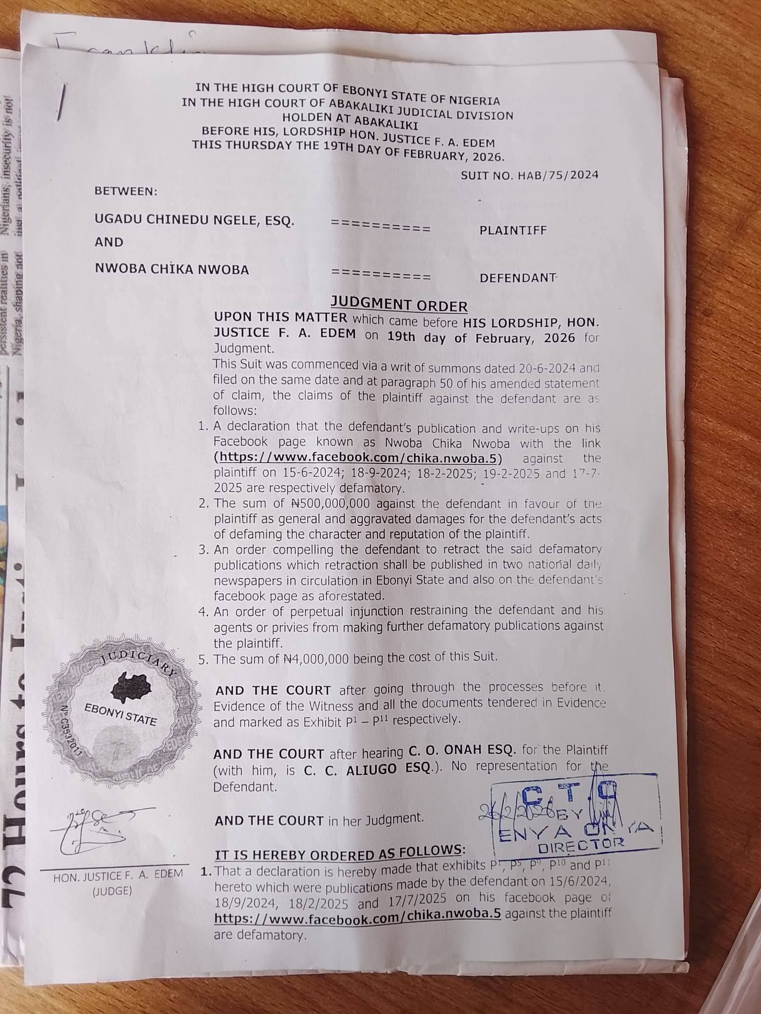 The judgment was delivered on Thursday, February 19, 2026, by Justice F. A. Edem of the High Court of Ebonyi State, Abakaliki Judicial Division, in suit number HAB/75/2024.
