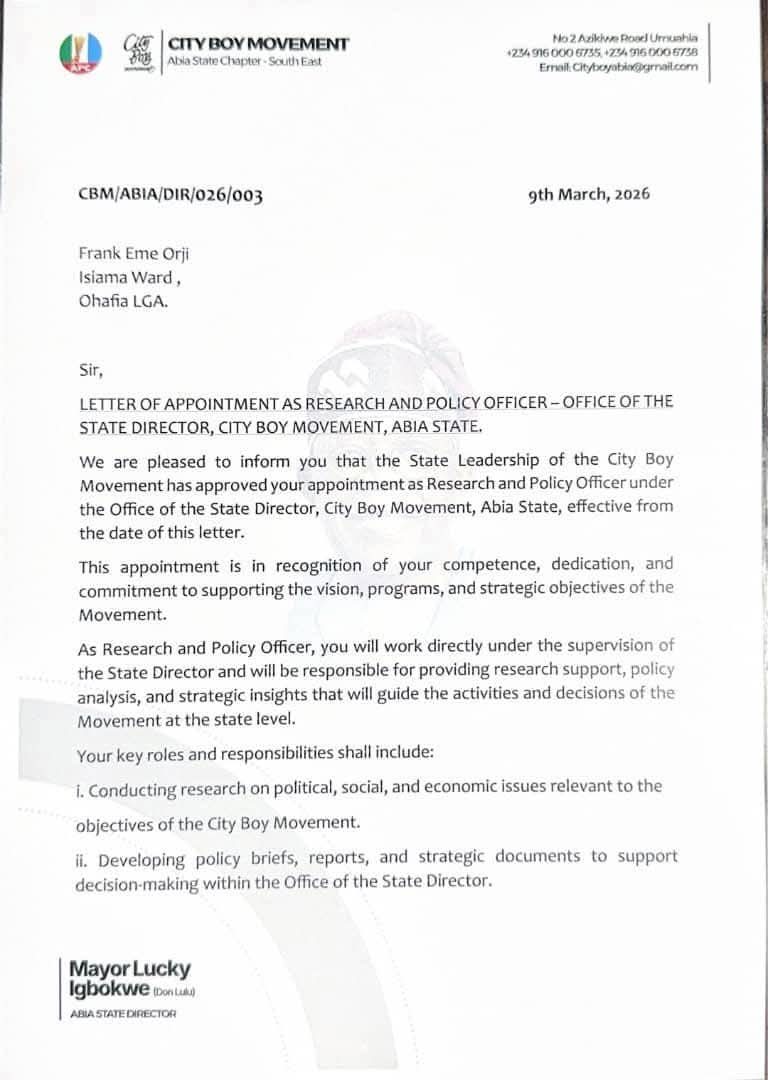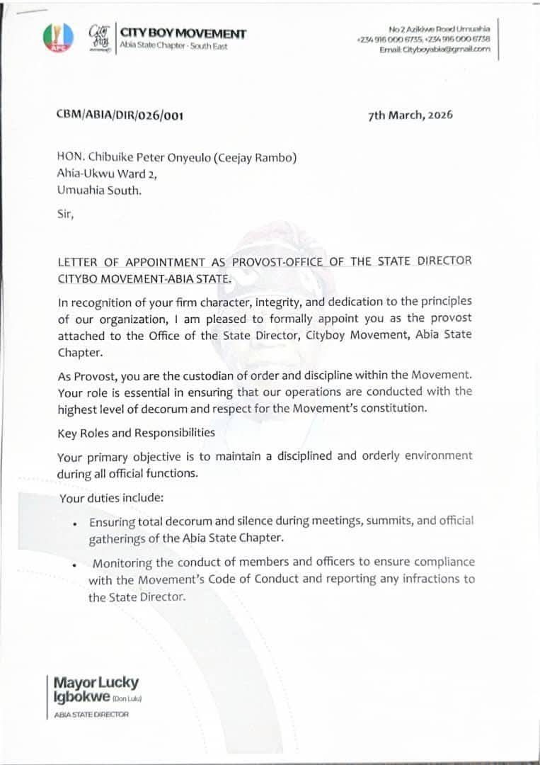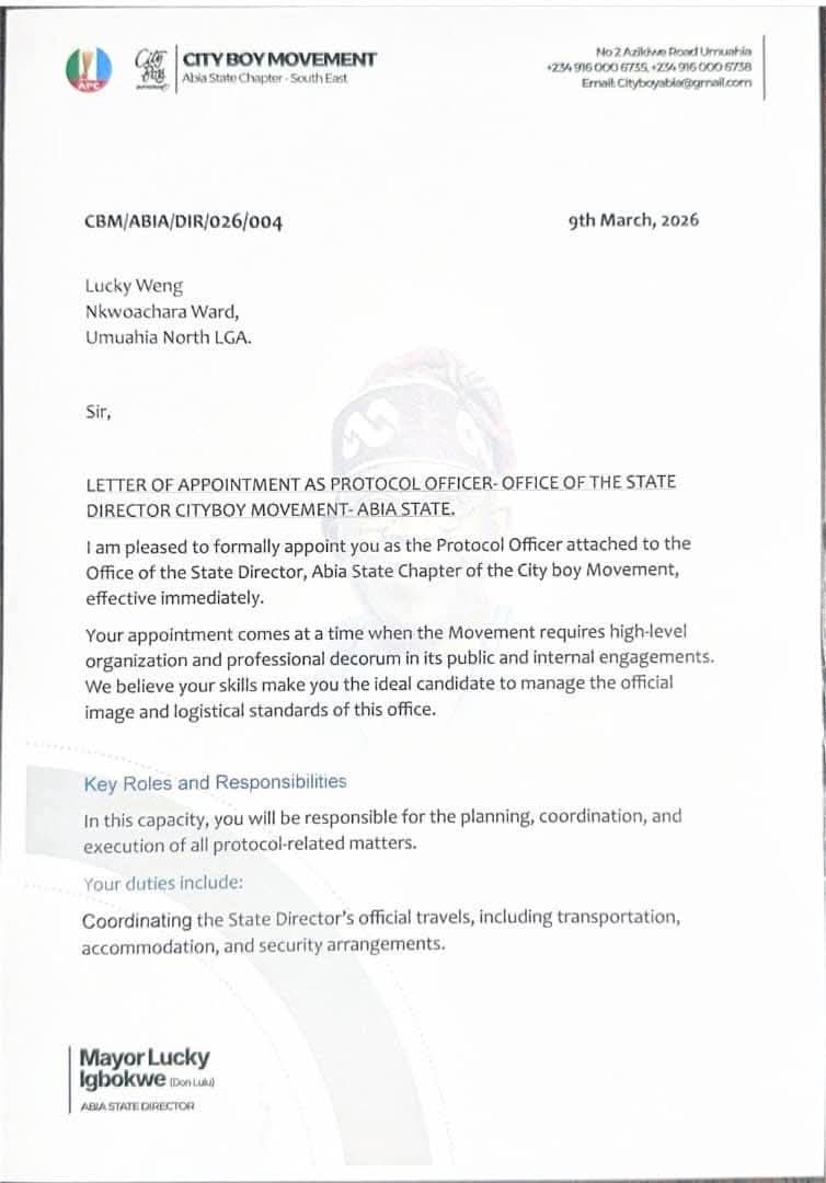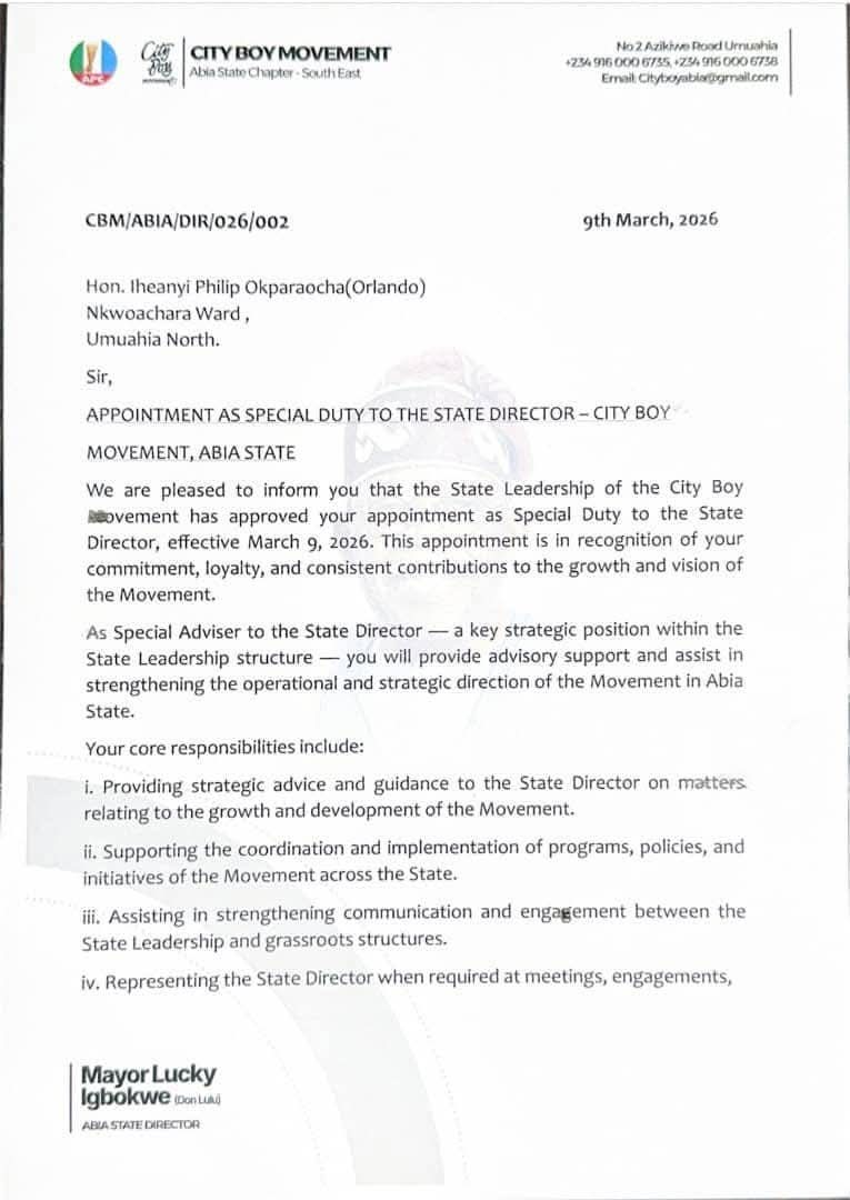 Speaking on the appointments, Lucky Igbokwe expressed confidence in the capacity and commitment of the appointees, noting that their emergence will further strengthen the City Boy Movement’s structure and effectiveness in Abia State.