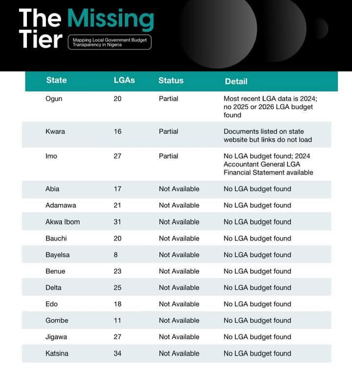 Titled “The Missing Tier: Mapping Local Government Budget Transparency in Nigeria,” the study found that just six states provide partial budget data, while a staggering 18 states, including Abia, publish no LGA budget information whatsoever on any official platform.