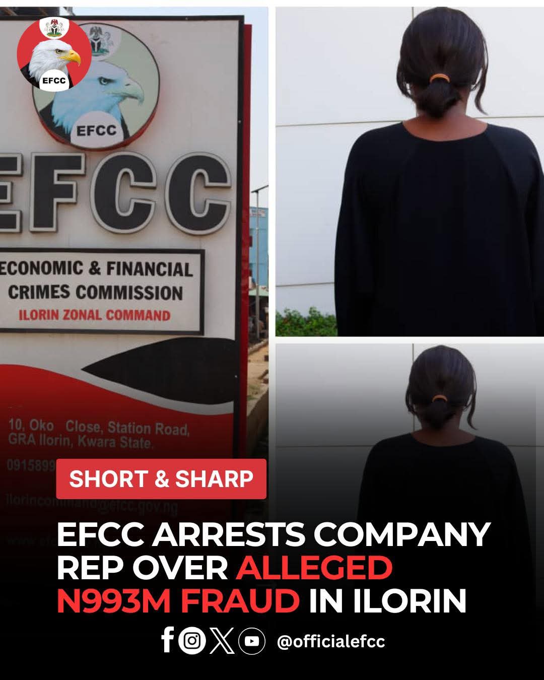 The Ilorin Zonal Directorate of the EFCC has arrested a company representative, Kofoworola Motunrayo Kolawole, over an alleged fraud to the tune of N993,247,796.70 (Nine Hundred and Ninety-Three Million, Two Hundred and Forty-Seven Thousand, Seven Hundred and Ninety-Six Naira, Seventy Kobo).