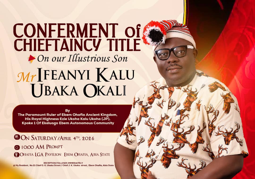 The conferment ceremony is scheduled to take place on Saturday, April 4, 2026, by 10:00 AM Prompt at Ohafia LGA Pavilion, Ebem Ohafia, Abia State