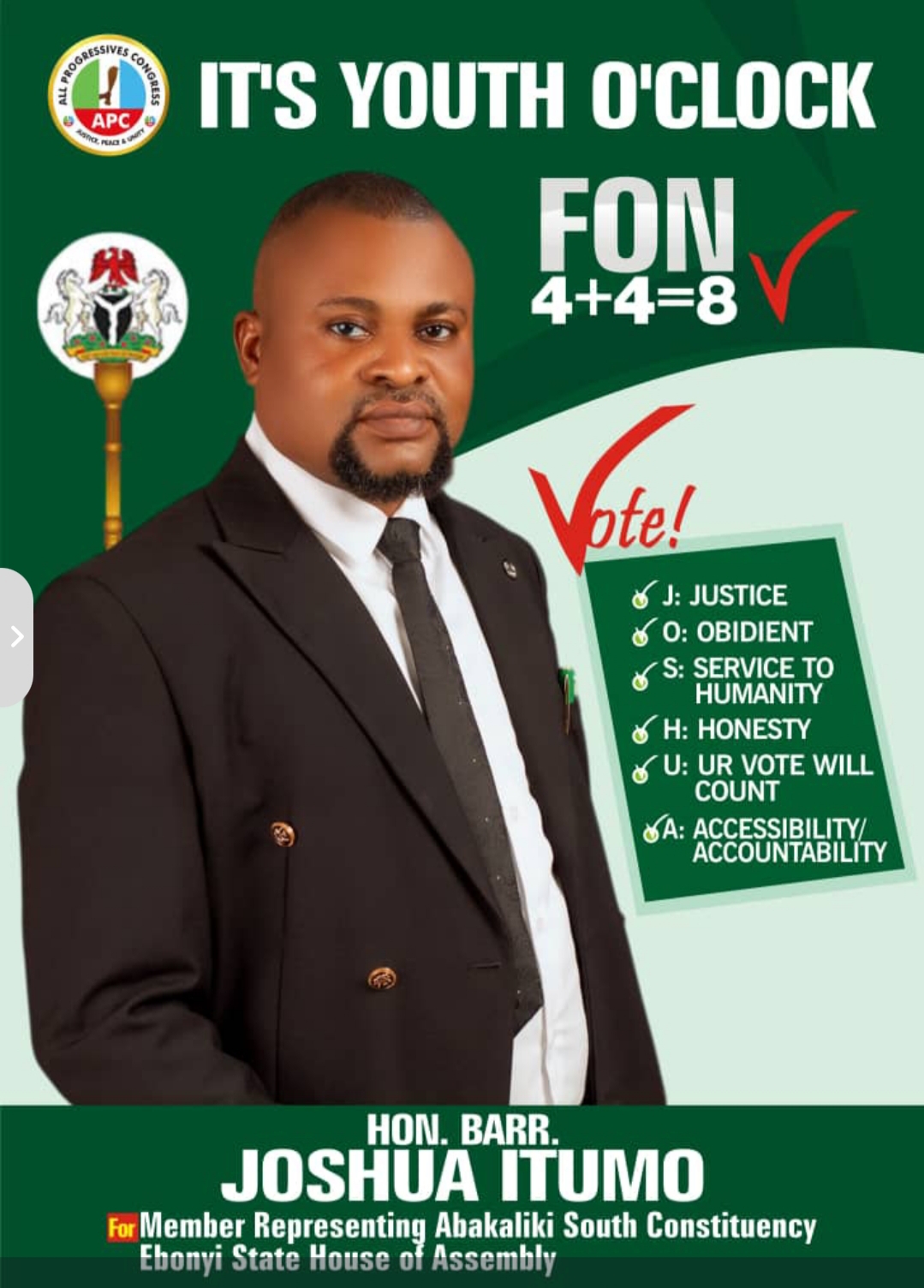 Abakaliki — Barrister Joshua Itumo, a legal practitioner and politician, has formally declared his intention to contest for the Abakaliki South Constituency seat in the Ebonyi State House of Assembly under the All Progressives Congress (APC).
