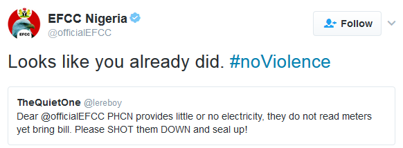 News FaceBook Twitter Pin It Linkedin Buffer WhatsApp EFCC Is At It Again! See What Happened This Time Around… ❚ dami ❚ 9 years ago❚ 0 0 You already voted! The Economic and Financial Crimes Commission EFCC has continued keeping Nigerians entertained via its twitter account. Hilarious FaceBook Twitter Pin It Linkedin Buffer WhatsApp