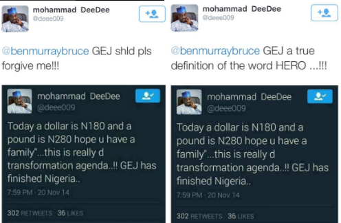 This twitter user said former president, Jonathan had finished Nigeria when the exchange rate was 180 naira to a dollar..He is now singing a different song with the exchange rate hitting 500naira to a dollar..