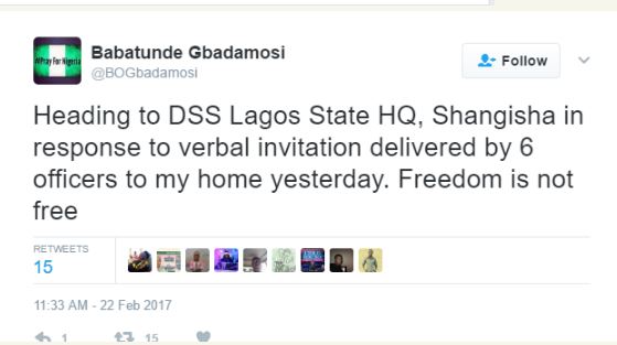Mr. Gbadamosi had earlier tweeted that he was invited for questioning by the security outfit and that he was on his way to their Lagos office at Shangisha, Magodo area.