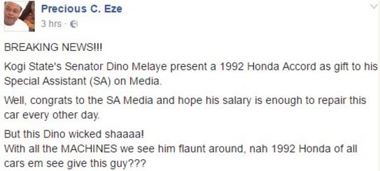 Sources say it’s ‘strange’ that Dino Melaye is very comfortable giving his PA such old model car…