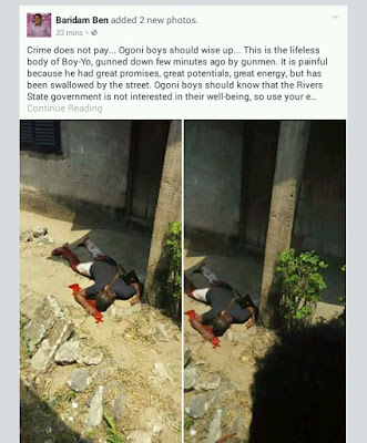 ‘Crime does not pay.Ogoni boys should wise up. This is the lifeless body of Boy-Yo, gunned down few minutes ago by gunmen. It is painful because he had great promises, great potentials, great energy, but has been swallowed by the street. Ogoni boys should know that the Rivers State government is not interested in their well-being, so use your energy for productive ventures and not militancy and cultism. This is a sad day for every street boy in Bori because this is someone we all know, and it is a sad reminder of everything that is wrong about the street. Countless of people like this are dying every single day in Ogoni land, but who the fuck even cares? Give his death a meaning by using it as a lesson and stay out of trouble.Rest In Peace Boy-Yo. Arsenal fan’