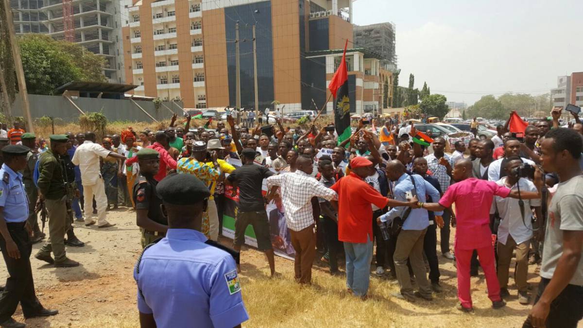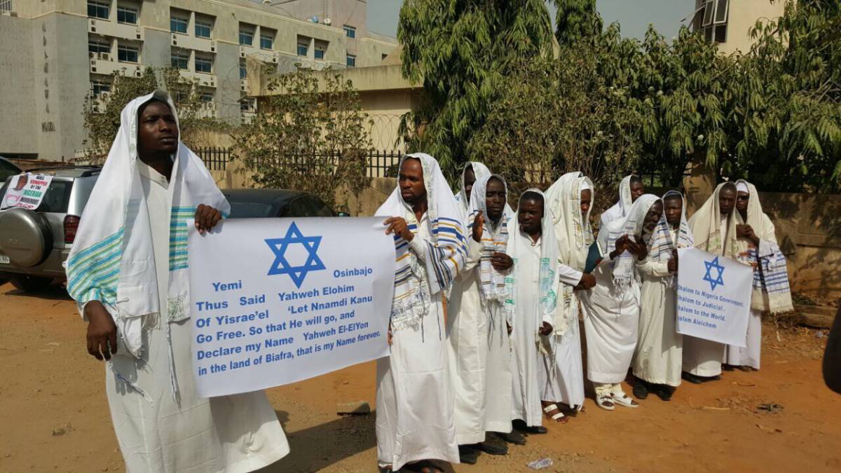 A large crowd of a group of Biafran activists who dressed as Jews as well as supporters of Indigenous Peoples of Biafra (IPOB) have staged a protest outside the premises of Federal High Court Abuja calling for the release of their leader, Nnamdi Kanu who is standing trial for treason just as the court struck out 6 counts charge out of 11 brought against him earlier today in Abuja.