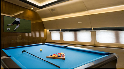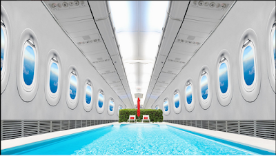 The airline posted three photos of the fantasy plane. It showed normal seating on the top floor and half of the middle floor with a games room and park in the rear. The bottom floor has a pool with deck chairs and shrubbery.