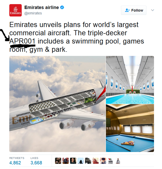 Emirates Airlines on Friday revealed plans for a giant jet that would include a grassy park, a swimming pool and a game room. But the grand plan appears to have come with a punchline: it was all an April Fool’s joke.