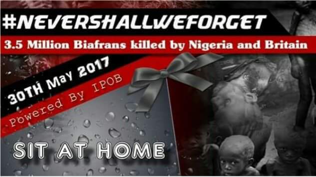 Through our action on 30th of May, 2017, we shall pay our great fathers, mothers, children and friends who have paid the greatest sacrifice by dying for the cause we all believe in, a befitting respect and remembrance by sitting at home and pray that their souls should not rest or become weak but continue to fight the spiritual battle while we fight the physically until Biafra is fully restored because it is only through this avenue, will their soul rest in perfect peace.