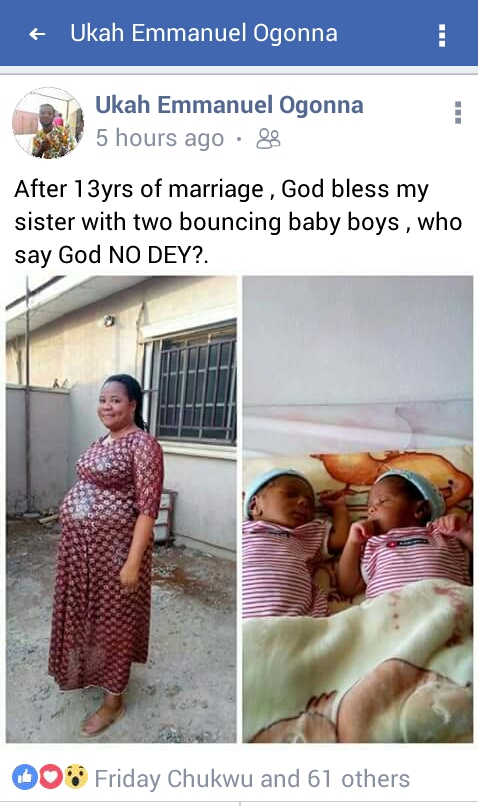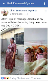 Just last month,God remembered her and wipes off a tears of 13 years of barrenness with a beautiful bouncing baby boys, Who said God No Dey he asked.