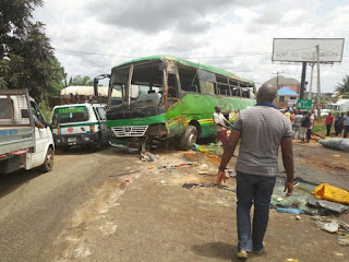 A ghastly motor accident occurred earlier today after Road Safety Roundabout in Owerri, Imo state. An eye witness account narrated that a luxury bus driver wanted to manoeuvre a salon car that was negotiating through the one-way lane.
