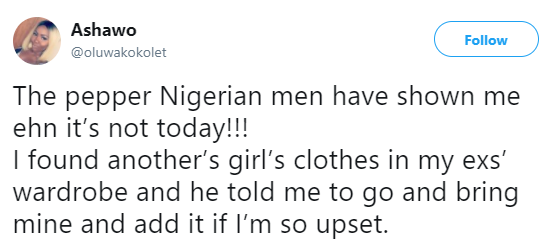 A Nigerian woman who goes by the Twitter name Ashawo has said dating Nigerian men is a form of self-harm.