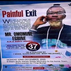 Rest easy, my brother. The post shares a funeral announcement for Omomineine Egbine, a 37-year-old Nigerian man from Oghior town in Delta State, known as "Dirt...